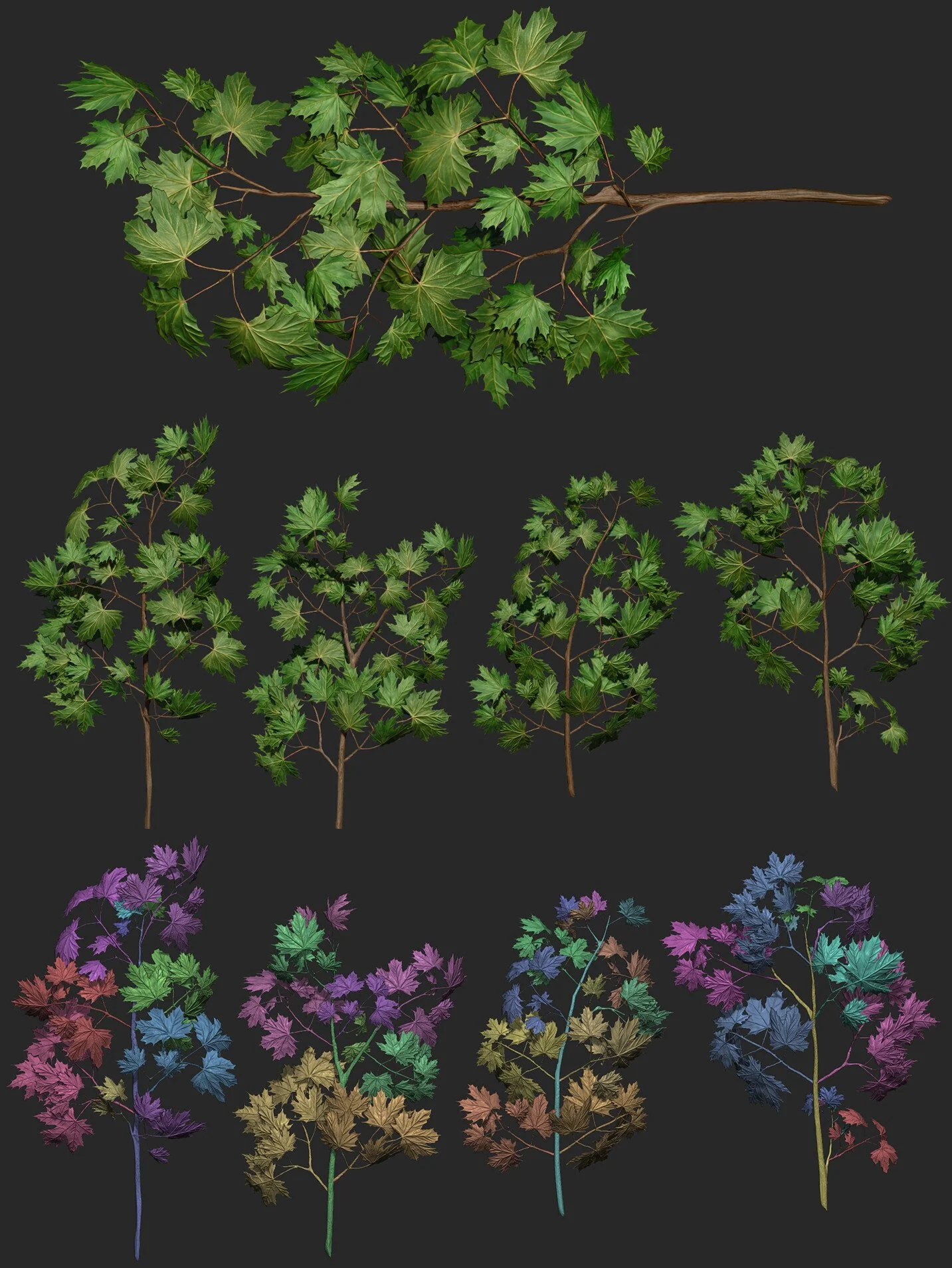 Model and texture leaves in ZBrush.Assemble small branches. Bake textures in ZBrush.Using texture sets to make low-poly branches in Maya. Assemble branches on the tree.